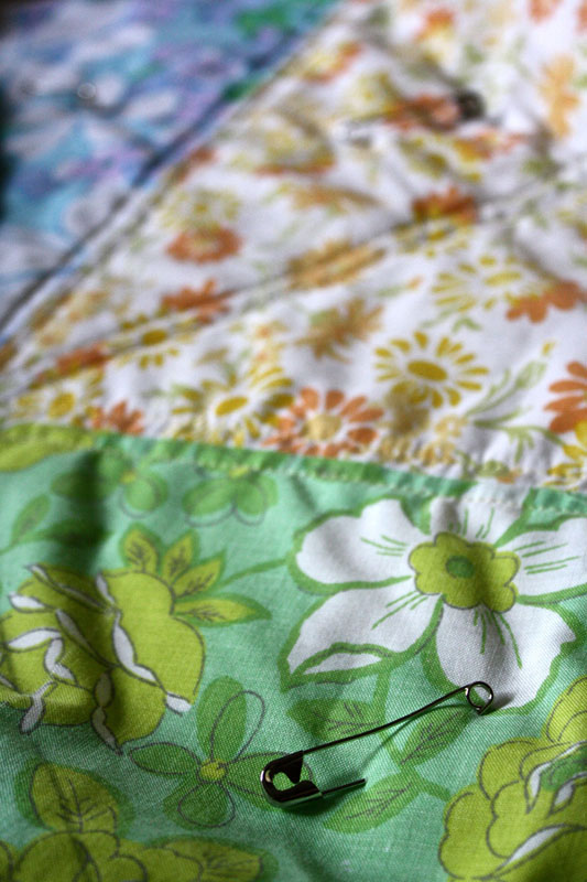 My vintage sheets quilt (Giant Vintage Star - In Color Order) quilted up much better than my first one (Disappearing Nine-Patch). Both of them have tucks here or crooked lines there, but the first one has a few tucks on the front PLUS I had to deal with a steep learning curve that included skipped stitches and jagged lines. I learned a lot and that is seen by studying the vintage sheets quilt!